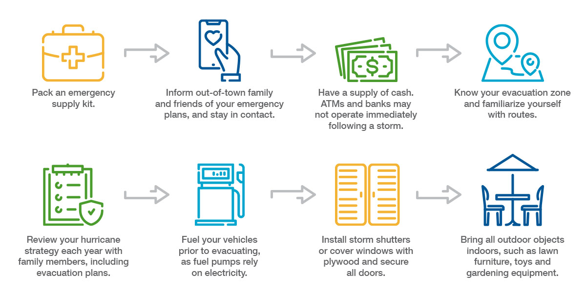 Disaster Preparedness Graphic. Pack an emergencysupply kit. Inform out-of-town familyand friends of your emergencyplans, and stay in contact. Have a supply of cash.ATMs and banks maynot operate immediatelyfollowing a storm. Know your evacuation zoneand familiarize yourselfwith routes. Review your hurricanestrategy each year withfamily members, includingevacuation plans. Fuel your vehiclesprior to evacuating,as fuel pumps relyon electricity. Install storm shuttersor cover windows withplywood and secureall doors. Bring all outdoor objectsindoors, such as lawnfurniture, toys andgardening equipment.Disaster Preparedness Graphic. Pack an emergencysupply kit. Inform out-of-town familyand friends of your emergencyplans, and stay in contact. Have a supply of cash.ATMs and banks maynot operate immediatelyfollowing a storm. Know your evacuation zoneand familiarize yourselfwith routes. Review your hurricanestrategy each year withfamily members, includingevacuation plans. Fuel your vehiclesprior to evacuating,as fuel pumps relyon electricity. Install storm shuttersor cover windows withplywood and secureall doors. Bring all outdoor objectsindoors, such as lawnfurniture, toys andgardening equipment.