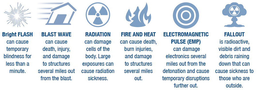 - ELECTROMAGNETIC PULSE (EMP) can damage electronics several miles out from the detonation and cause temporary disruptions further out.